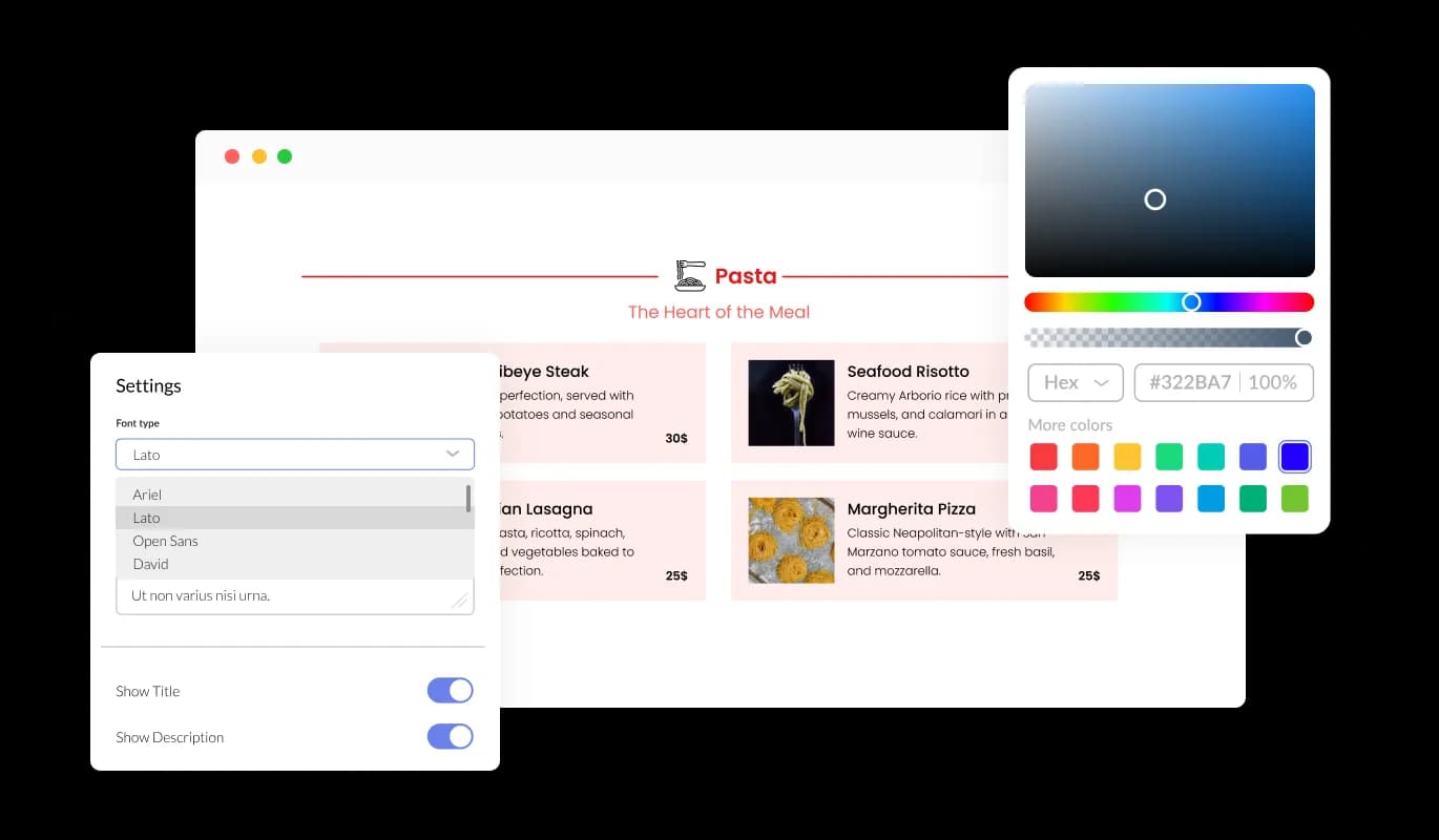 The Restaurant Menu Widget offers versatile design options with three distinct menu layouts, allowing you to choose the overall structure that best fits your website’s style. Additionally, each dish card can be displayed using one of four unique layouts, giving you the flexibility to highlight your dishes in the most appealing way. These customization options ensure your menu looks professional, aligns with your brand, and delivers a seamless browsing experience for your customers.